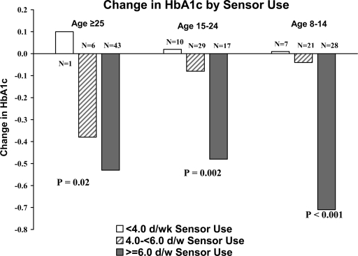 Results: The only baseline factors found to be associated with greater CGM use in month 6 were age >or=25 years (P < 0.001) and more frequent self-reported prestudy blood glucose meter measurements per day (P < 0.001). CGM use and the percentage of CGM glucose values between 71 and 180 mg/dl during the 1st month were predictive of CGM use in month 6 (P < 0.001 and P = 0.002, respectively). More frequent CGM use was associated with a greater reduction in A1C from baseline to 6 months (P < 0.001), a finding present in all age-groups.