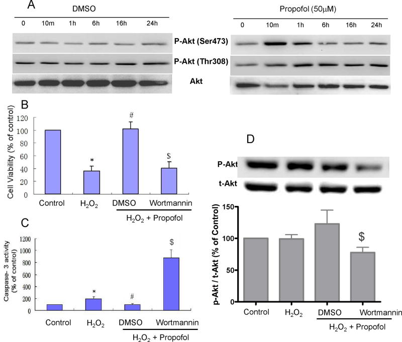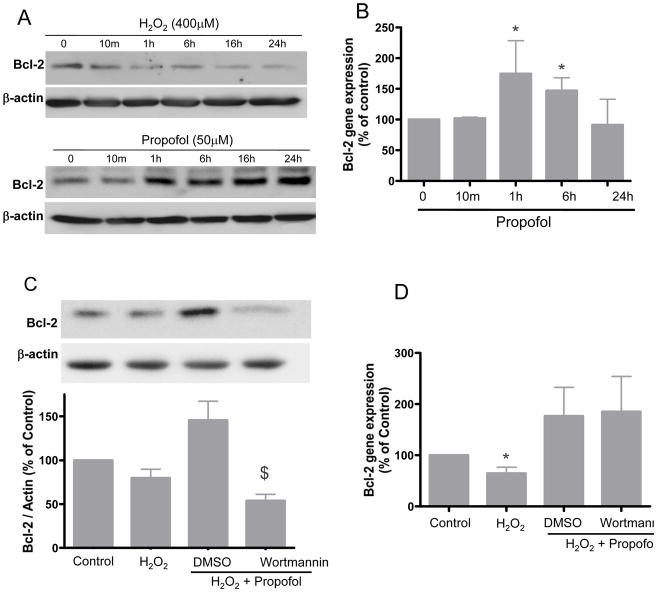 Propofol is a widely used intravenous anesthetic agent with antioxidant properties secondary to its phenol based chemical structure. Treatment with propofol has been found to attenuate oxidative stress and prevent ischemia/reperfusion injury in rat heart. Here, we report that propofol protects cardiac H9c2 cells from hydrogen peroxide (H(2)O(2))-induced injury by triggering the activation of Akt and a parallel up-regulation of Bcl-2. We show that pretreatment with propofol significantly protects against H(2)O(2)-induced injury. We further demonstrate that propofol activates the PI3K-Akt signaling pathway. The protective effect of propofol on H(2)O(2)-induced injury is reversed by PI3K inhibitor wortmannin, which effectively suppresses propofol-induced activation of Akt, up-regulation of Bcl-2, and protection from apoptosis. Collectively, our results reveal a new mechanism by which propofol inhibits H(2)O(2)-induced injury in cardiac H9c2 cells, supporting a potential application of propofol as a preemptive cardioprotectant in clinical settings such as coronary bypass surgery.