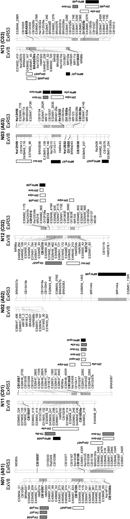 Little is known about the genetic control of heterosis in the complex polyploid crop species oilseed rape (Brassica napus L.). In this study, two large doubled-haploid (DH) mapping populations and two corresponding sets of backcrossed test hybrids (THs) were analysed in controlled greenhouse experiments and extensive field trials for seedling biomass and yield performance traits, respectively. Genetic maps from the two populations, aligned with the help of common simple sequence repeat markers, were used to localise and compare quantitative trait loci (QTL) related to the expression of heterosis for seedling developmental traits, plant height at flowering, thousand seed mass, seeds per silique, siliques per unit area and seed yield. QTL were mapped using data from the respective DH populations, their corresponding TH populations and from mid-parent heterosis (MPH) data, allowing additive and dominance effects along with digenic epistatic interactions to be estimated. A number of genome regions containing numerous heterosis-related QTL involved in different traits and at different developmental stages were identified at corresponding map positions in the two populations. The co-localisation of per se QTL from the DH population datasets with heterosis-related QTL from the MPH data could indicate regulatory loci that may also contribute to fixed heterosis in the highly duplicated B. napus genome. Given the key role of epistatic interactions in the expression of heterosis in oilseed rape, these QTL hotspots might harbour genes involved in regulation of heterosis (including fixed heterosis) for different traits throughout the plant life cycle, including a significant overall influence on heterosis for seed yield.