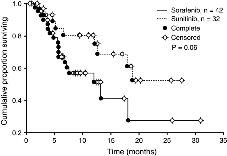 Methods: The analysis included 292 patients: 107 received sunitinib 50 mg/day in 6-week cycles (Schedule 4/2), 147 received sorafenib 800 mg/day, and 38 received placebo or IFN-alfa 9 MU t.i.w.
