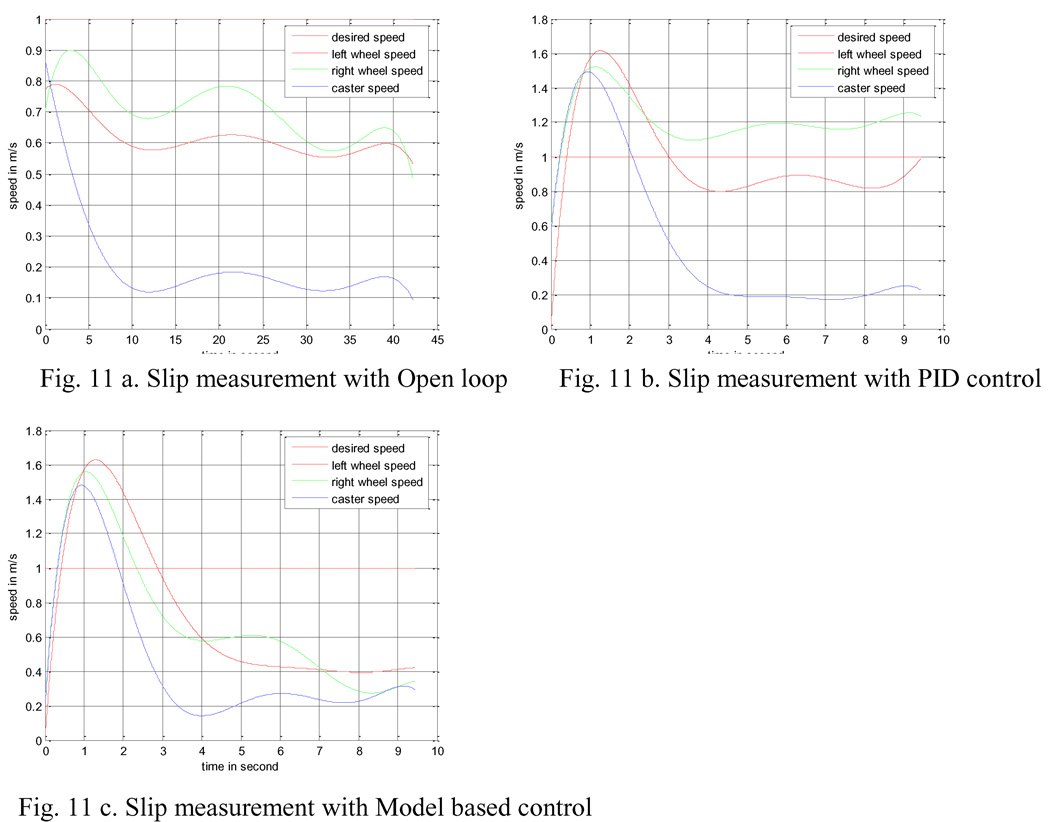 The purpose of this study was to evaluate the effects of three different control methods on driving speed variation and wheel slip of an electric-powered wheelchair (EPW). A kinematic model as well as 3D dynamic model was developed to control the velocity and traction of the wheelchair. A smart wheelchair platform was designed and built with a computerized controller and encoders to record wheel speeds and to detect the slip. A model based, a proportional-integral-derivative (PID) and an open-loop controller were applied with the EPW driving on four different surfaces at three specified speeds. The speed errors, variation, rise time, settling time and slip coefficient were calculated and compared for a speed step-response input. Experimental results showed that model based control performed best on all surfaces across the speeds.