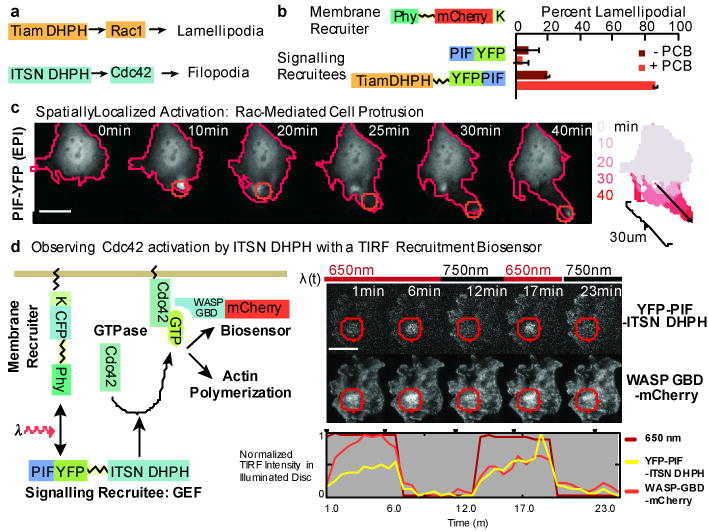 Genetically encodable optical reporters, such as green fluorescent protein, have revolutionized the observation and measurement of cellular states. However, the inverse challenge of using light to control precisely cellular behaviour has only recently begun to be addressed; semi-synthetic chromophore-tethered receptors and naturally occurring channel rhodopsins have been used to perturb directly neuronal networks. The difficulty of engineering light-sensitive proteins remains a significant impediment to the optical control of most cell-biological processes. Here we demonstrate the use of a new genetically encoded light-control system based on an optimized, reversible protein-protein interaction from the phytochrome signalling network of Arabidopsis thaliana. Because protein-protein interactions are one of the most general currencies of cellular information, this system can, in principle, be generically used to control diverse functions. Here we show that this system can be used to translocate target proteins precisely and reversibly to the membrane with micrometre spatial resolution and at the second timescale. We show that light-gated translocation of the upstream activators of Rho-family GTPases, which control the actin cytoskeleton, can be used to precisely reshape and direct the cell morphology of mammalian cells. The light-gated protein-protein interaction that has been optimized here should be useful for the design of diverse light-programmable reagents, potentially enabling a new generation of perturbative, quantitative experiments in cell biology.
