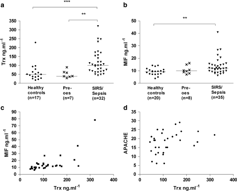 Methods: Enzyme-linked immunosorbent assay measurements of Trx, MIF, IL-6, -8, and -10 and enzyme-linked fluorescent assay determination of procalcitonin (PCT) in plasma from patients with SIRS/sepsis, neutropenic sepsis, healthy volunteers and pre-oesophagectomy patients.