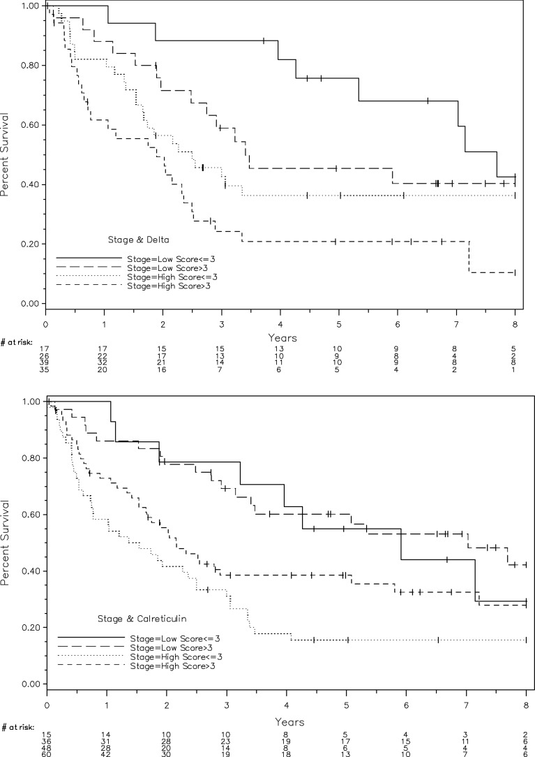 Results: All APM components except MB1, LMP2 and TAP2 had significantly lower staining in UC than in normal urothelium. No significant differences were found in APM component scores between different grades of UC. Squamous cell carcinoma had the highest scores, with UC intermediate and other types of BC lowest. High-stage UC demonstrated significantly lower staining for calnexin, LMP2, LMP7 and LMP10 than low-stage UC. With mean 3.6 years follow up, significantly worse survival was associated with a higher delta score in UC (P = 0.038) and a lower calreticulin score in all tumor types (P = 0.028).