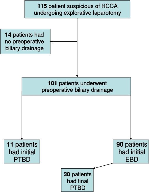 Methods: One hundred fifteen consecutive patients were explored for HCCA between 2001 and July 2008 and assigned by initial PBD procedure to either EBD or PTBD.