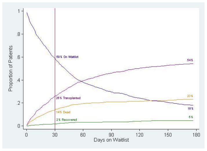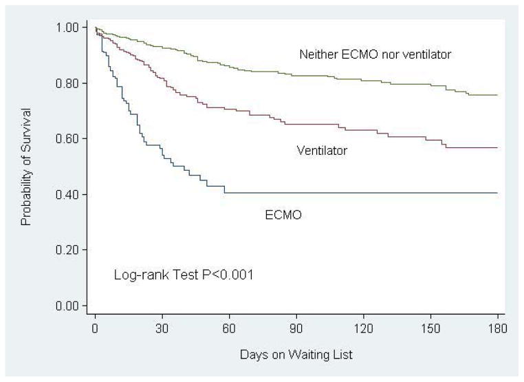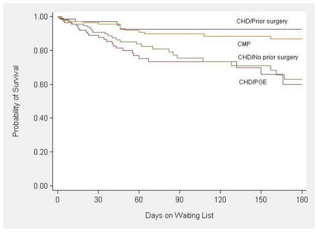 Results: Of the 1,133 listed infants, 61% were <3 months of age, 80% were listed as Status 1A, 64% had a congenital heart disease (CHD) and 31% had cardiomyopathy. Of 724 infants with CHD, 25% were on prostaglandin (PG) and 27% had a history of prior surgery. By 6 months after listing, 23% died on the wait-list and 54% were transplanted. Multivariate factors associated with wait-list mortality were weight <3 kg (hazard ratio [HR] 1.4, 95% confidence interval [CI] 1.0 to 1.9), extracorporeal membrane oxygenation (ECMO) support (HR 5.6, CI 4.0 to 7.9), ventilator support (HR 2.1, 95% CI 1.6 to 2.8), CHD with PG support (HR 2.8, 95% CI 1.8 to 4.3), CHD without prior surgery (HR 2.8, 95% CI 1.9 to 3.9) and non-white race/ethnicity (HR 1.8, 95% CI 1.4 to 2.3).