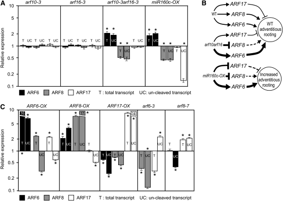 The development of shoot-borne roots, or adventitious roots, is indispensable for mass propagation of elite genotypes. It is a complex genetic trait with a high phenotypic plasticity due to multiple endogenous and environmental regulatory factors. We demonstrate here that a subtle balance of activator and repressor AUXIN RESPONSE FACTOR (ARF) transcripts controls adventitious root initiation. Moreover, microRNA activity appears to be required for fine-tuning of this process. Thus, ARF17, a target of miR160, is a negative regulator, and ARF6 and ARF8, targets of miR167, are positive regulators of adventitious rooting. The three ARFs display overlapping expression domains, interact genetically, and regulate each other's expression at both transcriptional and posttranscriptional levels by modulating miR160 and miR167 availability. This complex regulatory network includes an unexpected feedback regulation of microRNA homeostasis by direct and nondirect target transcription factors. These results provide evidence of microRNA control of phenotypic variability and are a significant step forward in understanding the molecular mechanisms regulating adventitious rooting.