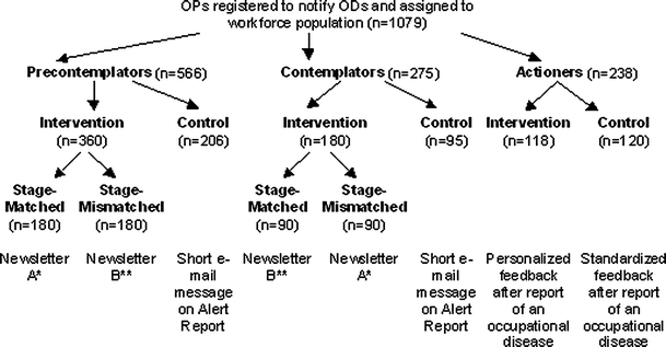 Methods: In a randomized controlled design, 1076 OPs were divided into three groups based on previous reporting behaviour: precontemplators not considering reporting, contemplators considering reporting and actioners reporting occupational diseases. Precontemplators and contemplators were randomly assigned to receive stage-matched, stage-mismatched or general information. Actioners were randomly assigned to receive personalized or standardized feedback upon notification. Outcome measures were the number of OPs reporting and the number of reported occupational diseases in a 180-day period before and after the intervention.