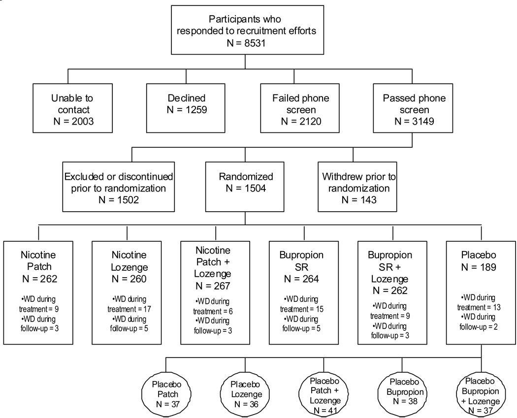 Patients: One thousand five hundred four adults who smoked at least 10 cigarettes per day during the past 6 months and reported being motivated to quit smoking. Participants were excluded if they reported using any form of tobacco other than cigarettes; current use of bupropion; having a current psychosis or schizophrenia diagnosis; or having medical contraindications for any of the study medications.