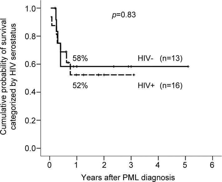 Results: Estimated probability of survival at 1 year was 52% for HIV+/PML and 58% for HIV- patients with PML. Patients with PML with detectable CTL within 3 months of diagnosis had a 1-year estimated survival of 73% compared to 46% for those without CTL (hazard ratio [HR] for death = 0.47, 95% confidence interval [CI] 0.13-1.75, p = 0.26). Patients with CTL response had an increased likelihood of having contrast enhancement of PML lesions and immune reconstitution inflammatory syndrome (odds ratio 3.7 and 7.8). Estimated 1-year survival was 48% in HIV+ patients with PML with CD4 count <200/microL at PML diagnosis compared to 67% in those with CD4 >200/microL (HR for death 1.41, 95% CI 0.27-7.38, p = 0.68). JCV DNA was detected in the urine of 48% and in the blood of 56% of patients with PML, but viruria and viremia were not associated with survival.