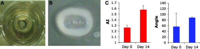Many cartilaginous tissues such as intervertebral disc (IVD) display a heterogeneous collagen microstructure that results in mechanical anisotropy. These structures are responsible for mechanical function of the tissue and regulate cellular interactions and metabolic responses of cells embedded within these tissues. Using collagen gels seeded with ovine annulus fibrosus cells, constructs of varying structure and heterogeneity were created to mimic the circumferential alignment of the IVD. Alignment was induced within gels by contracting annular gels around an inner boundary using both a polyethylene center and alginate center to create a composite engineered IVD. Collagen alignment and heterogeneity were measured using second harmonic generation microscopy. Decreasing initial collagen density from 2.5 mg/mL to 1 mg/mL produced greater contraction of constructs, resulting in gels that were 55% and 6.2% of the original area after culture, respectively. As a result, more alignment occurred in annular-shaped 1 mg/mL gels compared with 2.5 mg/mL gels (p < 0.05). This alignment was also produced in a composite-engineered IVD with alginate nucleus pulposus. The resulting collagen alignment could promote further aligned collagen development necessary for the creation of a mechanically functional tissue-engineered IVD.