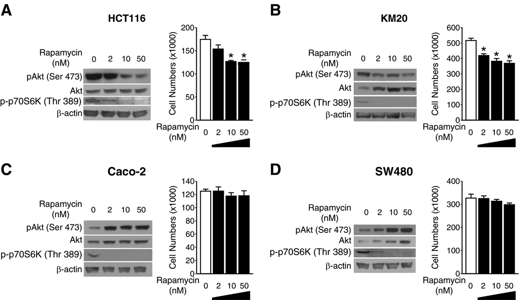 Experimental design: HCT116, KM20, Caco-2, and SW480 human CRC cells were used to determine the effects of pharmacologic (using rapamycin) or genetic (using RNAi) blockade of mTOR signaling on cell proliferation, apoptosis, cell cycle progression, and subcutaneous growth in vivo.