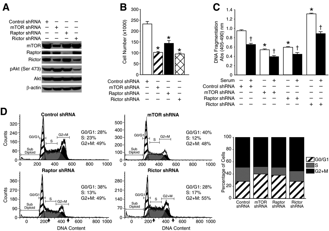 Results: We show that the mTOR complex proteins mTOR, Raptor, and Rictor are overexpressed in CRC. Treatment with rapamycin significantly decreased proliferation of certain CRC cell lines (rapamycin sensitive), whereas other cell lines were resistant to its effects (rapamycin resistant). Transient siRNA-mediated knockdown of the mTORC2 protein, Rictor, significantly decreased proliferation of both rapamycin-sensitive and rapamycin-resistant CRC cells. Stable shRNA-mediated knockdown of both mTORC1 and mTORC2 decreased proliferation, increased apoptosis, and attenuated cell cycle progression in rapamycin-sensitive CRCs. Moreover, stable knockdown of both mTORC1 and mTORC2 decreased proliferation and attenuated cell cycle progression, whereas only mTORC2 knockdown increased apoptosis in rapamycin-resistant CRCs. Finally, knockdown of both mTORC1 and mTORC2 inhibited growth of rapamycin-sensitive and rapamycin-resistant CRCs in vivo when implanted as tumor xenografts.