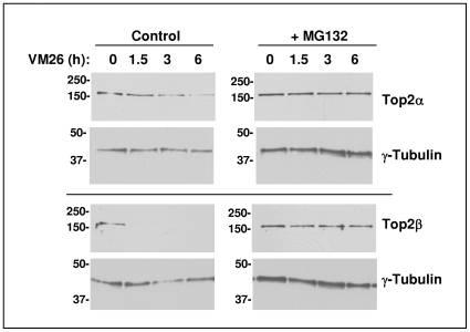 Background: The topoisomerases Top1, Top2alpha and Top2beta are important molecular targets for antitumor drugs, which specifically poison Top1 or Top2 isomers. While it was previously demonstrated that poisoned Top1 and Top2beta are subject to proteasomal degradation, this phenomena was not demonstrated for Top2alpha.