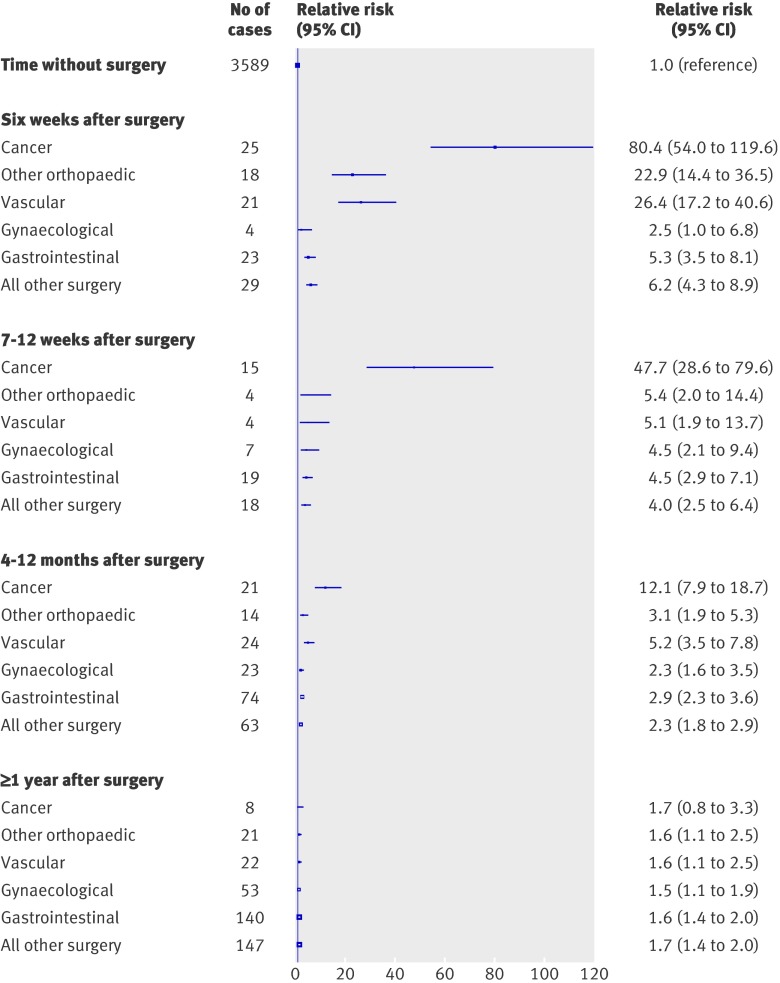 Results: Compared with not having surgery, women were 70 times more likely to be admitted with venous thromboembolism in the first six weeks after an inpatient operation (relative risk 69.1, 95% confidence interval 63.1 to 75.6) and 10 times more likely after a day case operation (9.6, 8.0 to 11.5). The risks were lower but still substantially increased 7-12 weeks after surgery (19.6, 16.6 to 23.1 and 5.5, 4.3 to 7.0, respectively). This pattern of risk was similar for pulmonary embolism (n=2487) and deep venous thrombosis (n=3529). The postoperative risks of venous thromboembolism varied considerably by surgery type, with highest relative risks after inpatient surgery for hip or knee replacement and for cancer-1-6 weeks after surgery the relative risks were, respectively, 220.6 (187.8 to 259.2) and 91.6 (73.9 to 113.4).