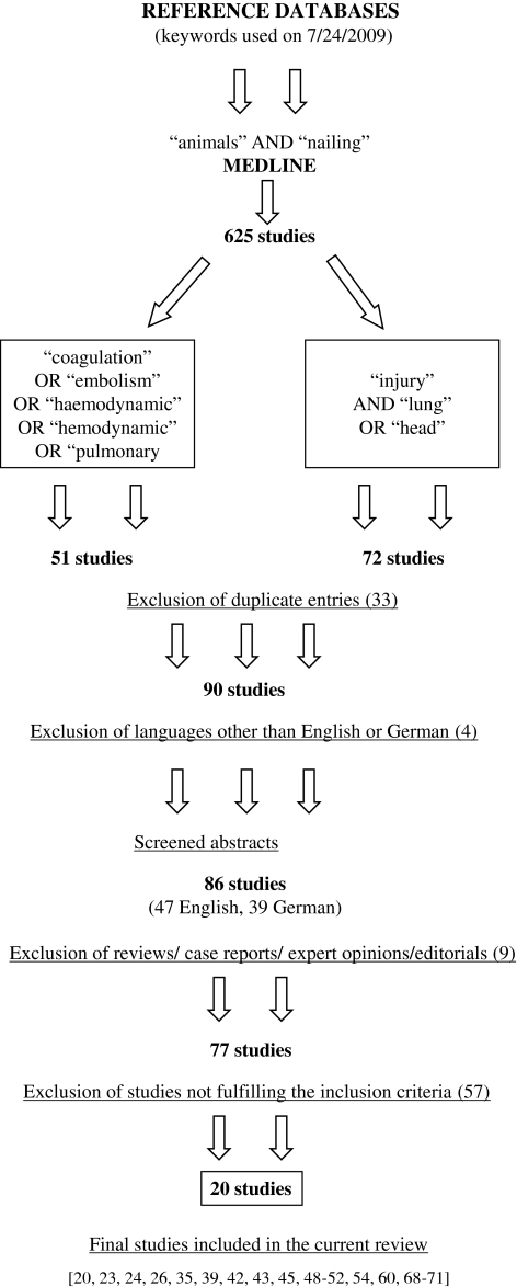 Methods: We reviewed the available literature of animal studies that used surgery, and particularly nailing, as a second hit. The reviewed studies were retrieved through an electronic search of the MEDLINE database. We analyzed the methods of creating the first and second hits (nailing), the characteristics of the animal models, the variables examined, and the pathophysiologic responses, which appeared after the second hit.