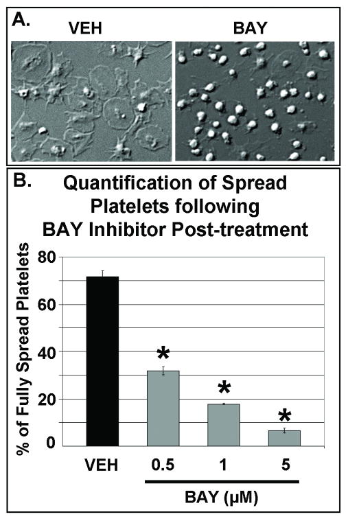 Methods and results: Anucleate platelets exposed to NF-kappaB inhibitors demonstrated impaired fundamental functions involved in repairing vascular injury and thrombus formation. Specifically, NF-kappaB inhibition diminished lamellapodia formation, decreased clot retraction times, and reduced thrombus stability. Moreover, inhibition of I-kappaB-alpha phosphorylation (BAY-11-7082) reverted fully spread platelets back to a spheroid morphology. Addition of recombinant IKK-beta or I-kappaB-alpha protein to BAY inhibitor-treated platelets partially restored platelet spreading in I-kappaB-alpha inhibited platelets, and addition of active IKK-beta increased endogenous I-kappaB-alpha phosphorylation levels.