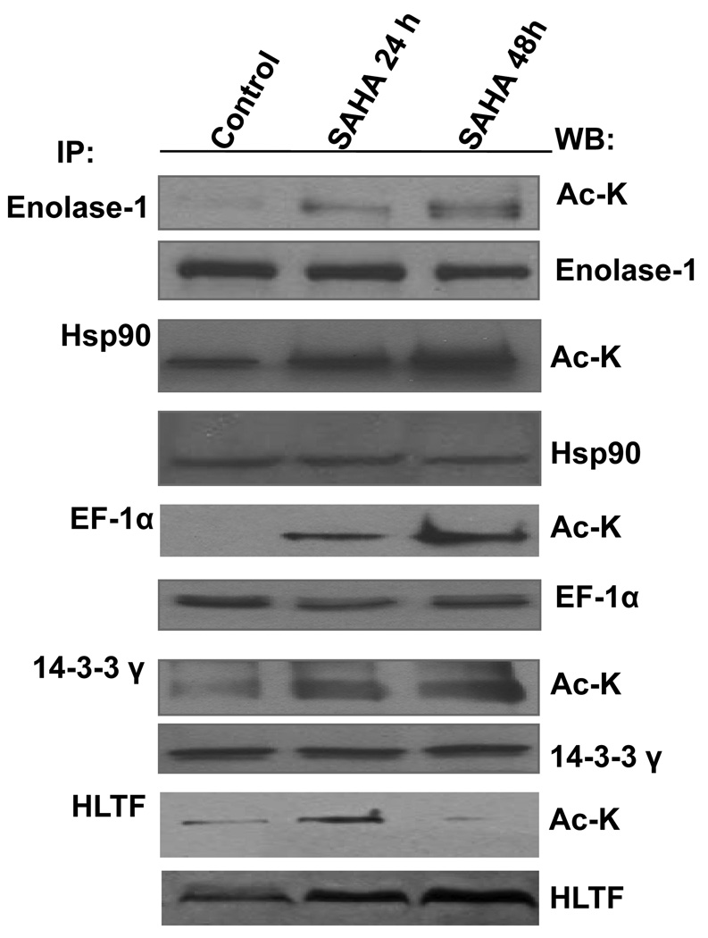 Histone deacetylases (HDACs) play critical roles in silencing tumor suppressor genes. HDAC inhibitors reactivate tumor suppressor genes and inhibit tumor cell growth in vitro and in vivo, and several HDAC inhibitors are currently being evaluated in clinical trials for cancer therapy. A comprehensive analysis of proteins regulated by HDAC inhibitors would enhance our ability to define and characterize their essential therapeutic targets. Here, we employed stable isotope labeling with amino acids in cell culture-based quantitative proteomics to identify acetylated proteins in human breast cancer cells. Treatment with the clinically relevant HDAC inhibitor, suberoylanilide hydroxamic acid (vorinostat), induces lysine acetylation of 61 proteins in MDA-MB-231 human breast cancer cells. Suberoylanilide hydroxamic acid not only induces lysine acetylation in chromatin-associated proteins, but also acetylates previously unrecognized nonhistone proteins, including transcriptional factors and regulators, chaperones, cell structure proteins, and glycolytic enzymes in a time-dependent manner. Knowledge of the full repertoire of acetylated proteins will provide a foundation for further defining the functions of HDACs in cancer cells.