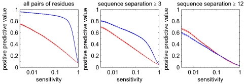 (blue), and the posterior probabilities (red). The vertical axis shows mean positive predictive value (PPV, solid line) plus and minus one standard error (dashed lines) as a function of sensitivity (horizontal axis, shown on a logarithmic scale). The left panel shows predictions for all residue pairs, the middle using only predictions for residues separated by at least