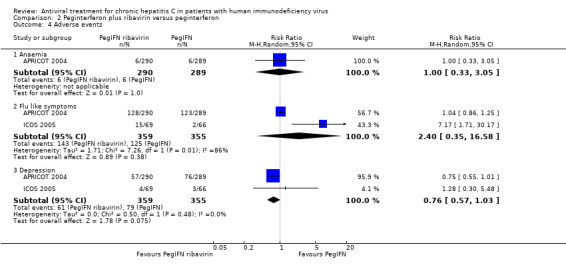 Main results: Fourteen trials were included. None of the included 2269 patients were previously treated for chronic hepatitis C. Peginterferon (either 2a, 180 microgram, or 2b, 1.5 microgram/kg, once weekly) plus ribavirin was more effective in achieving end of treatment and sustained virological response compared with interferon plus ribavirin (5 trials, 1340 patients) or peginterferon (2 trials, 714 patients). The benefit of peginterferon plus ribavirin was seen irrespective of HCV genotype although patients with genotype 1 or 4 had lower response rates (27%) than patients with genotype 2 or 3 (56%). The remaining trials compared different treatment regimens in patients who were treatment naive or had no virological response after three months of treatment, but overall they had not enough power to show any effect of increasing the dose of interferon or adding both amantadine or ribavirin. The overall mortality was 23/2111 patients with no significant differences between treatment regimens. Treatment increased the risk of adverse events including anaemia and flu-like symptoms, and several serious adverse events occurred including fatal lactic acidosis, liver failure, and suicide due to depression.