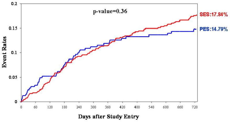 Methods and results: Using the National Heart, Lung, and Blood Institute Dynamic Registry, we evaluated 2-year outcomes of diabetic patients undergoing percutaneous coronary interventions with SES (n=677) and PES (n=328). Clinical and demographic characteristics, including age, body mass index, insulin use, left ventricular function, and aspirin/clopidogrel use postprocedure, did not differ significantly between the groups except that PES-treated patients had a greater frequency of hypertension and hyperlipidemia. At the 2-year follow-up, no significant differences were observed between PES and SES with regard to safety or efficacy end points. PES- and SES-treated patients had similar rates of death (10.7% versus 8.2%, P=0.20), death and myocardial infarction (14.9% versus 13.6%, P=0.55), repeat revascularization (14.8% versus 17.8%, P=0.36), and stent thrombosis (1.3% versus 1.3%, P=0.95). After adjustment, no significant differences between the 2 stent types in any outcome were observed.