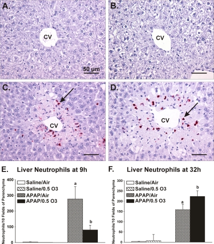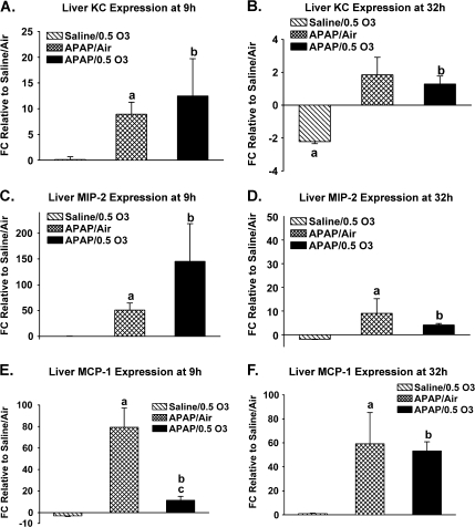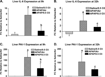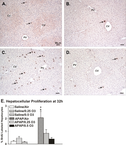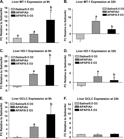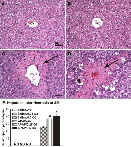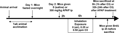 Ozone (O(3)), an oxidant air pollutant in photochemical smog, principally targets epithelial cells lining the respiratory tract. However, changes in gene expression have also been reported in livers of O(3)-exposed mice. The principal aim of the present study was to determine if acute exposure to environmentally relevant concentrations of O(3) could cause exacerbation of drug-induced liver injury in mice. Overdose with acetaminophen (APAP) is the most common cause of drug-induced liver injury in developed countries. In the present study, we examined the hepatic effects of acute O(3) exposure in mice pretreated with a hepatotoxic dose of APAP. C57BL/6 male mice were fasted overnight and then given APAP (300 mg/kg ip) or saline vehicle (0 mg/kg APAP). Two hours later, mice were exposed to 0, 0.25, or 0.5 ppm O(3) for 6 h and then sacrificed 9 or 32 h after APAP administration (1 or 24 h after O(3) exposure, respectively). Animals euthanized at 32 h were given 5-bromo-2-deoxyuridine 2 h before sacrifice to identify hepatocytes undergoing reparative DNA synthesis. Saline-treated mice exposed to either air or O(3) had no liver injury. All APAP-treated mice developed marked centrilobular hepatocellular necrosis that increased in severity with time after APAP exposure. O(3) exposure increased the severity of APAP-induced liver injury as indicated by an increase in necrotic hepatic tissue and plasma alanine aminotransferase activity. O(3) also caused an increase in neutrophil accumulation in livers of APAP-treated animals. APAP induced a 10-fold increase in the number of bromodeoxyuridine-labeled hepatocytes that was markedly attenuated by O(3) exposure. Gene expression analysis 9 h after APAP revealed differential expression of genes involved in inflammation, oxidative stress, and cellular regeneration in mice treated with APAP and O(3) compared to APAP or O(3) alone, providing some indications of the mechanisms behind the APAP and O(3) potentiation. These results suggest that acute exposure to near ambient concentrations of this oxidant air pollutant may exacerbate drug-induced liver injury by delaying hepatic repair.