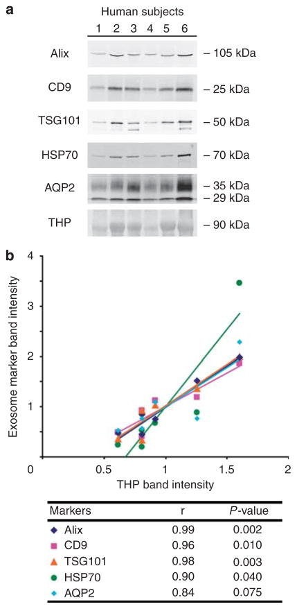 Urinary exosomes have been proposed as starting material for discovery of protein biomarkers of kidney disease. Current protocols for their isolation use a two-step differential centrifugation process. Due to their low density, exosomes are expected to remain in the low-speed (17,000 x g) supernatant and to sediment only when the sample is spun at high speed (200,000 x g). Analysis using western blot and electron microscopy found that urinary exosomes are also present in the low-speed pellet entrapped by polymeric Tamm-Horsfall protein, thus diminishing the procedure's reproducibility. Here we show that addition of dithiothreitol to the low-speed pellet disrupted the polymeric network, presumably by reduction of disulfide bonds linking the monomers. This modification shifted the exosomal proteins from the low- to the high-speed pellet. Also, by shifting the Tamm-Horsfall protein to the high-speed pellet, the use of dithiothreitol makes it feasible to use Tamm-Horsfall protein to normalize excretion rates of exosomal proteins in spot urines. We tested this by western blot, and found that there was a high degree of correlation between exosomal proteins and Tamm-Horsfall protein in the high-speed pellet. Since the yield of exosomes by differential centrifugation can be increased by chemical reduction, Tamm-Horsfall protein may be a suitable normalizing variable for urinary exosome studies when quantitative urine collections are not practical.