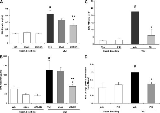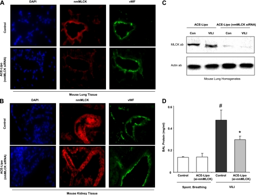 Acute lung injury (ALI) and mechanical ventilator-induced lung injury (VILI), major causes of acute respiratory failure with elevated morbidity and mortality, are characterized by significant pulmonary inflammation and alveolar/vascular barrier dysfunction. Previous studies highlighted the role of the non-muscle myosin light chain kinase isoform (nmMLCK) as an essential element of the inflammatory response, with variants in the MYLK gene that contribute to ALI susceptibility. To define nmMLCK involvement further in acute inflammatory syndromes, we used two murine models of inflammatory lung injury, induced by either an intratracheal administration of lipopolysaccharide (LPS model) or mechanical ventilation with increased tidal volumes (the VILI model). Intravenous delivery of the membrane-permeant MLC kinase peptide inhibitor, PIK, produced a dose-dependent attenuation of both LPS-induced lung inflammation and VILI (~50% reductions in alveolar/vascular permeability and leukocyte influx). Intravenous injections of nmMLCK silencing RNA, either directly or as cargo within angiotensin-converting enzyme (ACE) antibody-conjugated liposomes (to target the pulmonary vasculature selectively), decreased nmMLCK lung expression (∼70% reduction) and significantly attenuated LPS-induced and VILI-induced lung inflammation (∼40% reduction in bronchoalveolar lavage protein). Compared with wild-type mice, nmMLCK knockout mice were significantly protected from VILI, with significant reductions in VILI-induced gene expression in biological pathways such as nrf2-mediated oxidative stress, coagulation, p53-signaling, leukocyte extravasation, and IL-6-signaling. These studies validate nmMLCK as an attractive target for ameliorating the adverse effects of dysregulated lung inflammation.