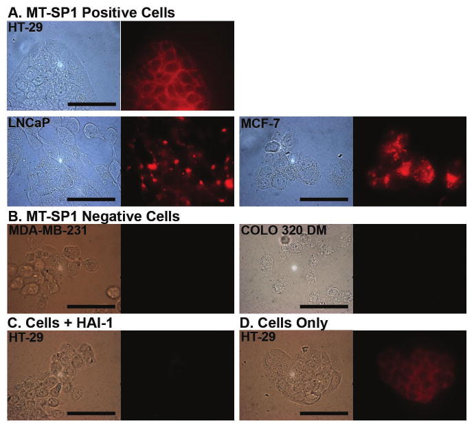 The cell surface protease membrane-type serine protease-1 (MT-SP1), also known as matriptase, is often upregulated in epithelial cancers. We hypothesized that dysregulation of MT-SP1 with regard to its cognate inhibitor hepatocyte growth factor activator inhibitor-1 (HAI-1), a situation that increases proteolytic activity, might be exploited for imaging purposes to differentiate malignant from normal tissue. In this study, we show that MT-SP1 is active on cancer cells and that its activity may be targeted in vivo for tumor detection. A proteolytic activity assay with several MT-SP1-positive human cancer cell lines showed that MT-SP1 antibodies that inhibit recombinant enzyme activity in vitro also bind and inhibit the full-length enzyme expressed on cells. In contrast, in the same assay, MT-SP1-negative cancer cell lines were inactive. Fluorescence microscopy confirmed the cell surface localization of labeled antibodies bound to MT-SP1-positive cells. To evaluate in vivo targeting capability, 0.7 to 2 nmoles of fluorescently labeled antibodies were administered to mice bearing tumors that were positive or negative for MT-SP1. Antibodies localized to MT-SP1-positive tumors (n = 3), permitting visualization of MT-SP1 activity, whereas MT-SP1-negative tumors (n = 2) were not visualized. Our findings define MT-SP1 activity as a useful biomarker to visualize epithelial cancers using a noninvasive antibody-based method.