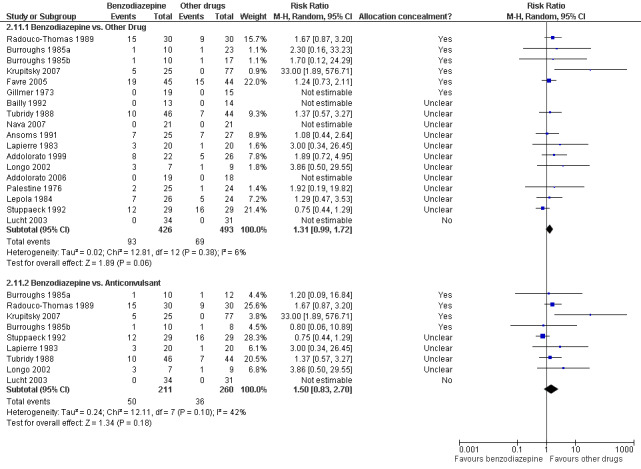 Authors' conclusions: Benzodiazepines showed a protective benefit against alcohol withdrawal symptoms, in particular seizures, when compared to placebo and a potentially protective benefit for many outcomes when compared with other drugs. Nevertheless, no definite conclusions about the effectiveness and safety of benzodiazepines was possible, because of the heterogeneity of the trials both in interventions and the assessment of outcomes.