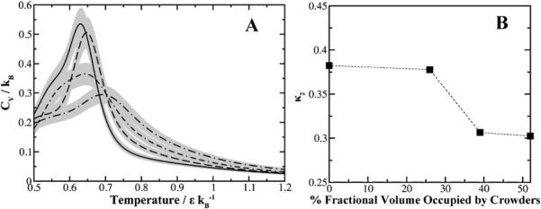 ) 39%, (-·-) 52% fractional volume. Gray regions indicate the estimated error for each curve. (B) Degree of cooperativity for Trp-cage as measured by the ratio κ2. Increasing concentrations of crowders lowers the two-state folding cooperativity.