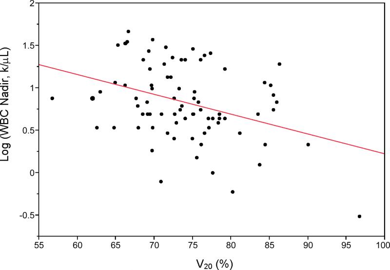 Results: In the validation cohort, significant negative correlations were observed between white blood cell count nadir and V10 (regression coefficient (β)=-0.060, p=0.009) and V20 (β=-0.044, p=0.010). In the combined cohort, the (adjusted) β estimates for log (white blood cell) vs. V10 and V20 were as follows: -0.022 (p=0.025) and -0.021 (p=0.002), respectively. Patients with V10≥95% were more likely to experience Grade≥3 leukopenia (68.8% vs. 24.6%, p<0.001) than were patients with V20>76% (57.7% vs. 21.8%, p=0.001).