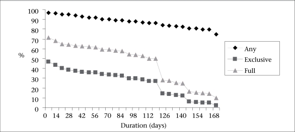 A prospective cohort study of 1,520 mothers from Zhejiang province of China was undertaken to determine the duration of breastfeeding and associated factors during the first six months postpartum. Most (95.3%) mothers had introduced complementary foods by six months, making them at risk from contaminated infant formula. The mean duration of'any breastfeeding' was greater than 180 days but only 48 days for 'exclusive breastfeeding'. Factors relating to cessation of any breastfeeding were maternal age, timing of the breastfeeding decision, admission of the infant to a special-care nursery, return of the mother to work, the early introduction of water and/or other complementary foods, and their location of residence. The introduction of infant formula before three months was positively associated with the late decision to breastfeed, births in city, and infants being given a prelacteal feed. To combat the melamine disaster, strategies to improve the duration of breastfeeding must be developed taking these factors into account.