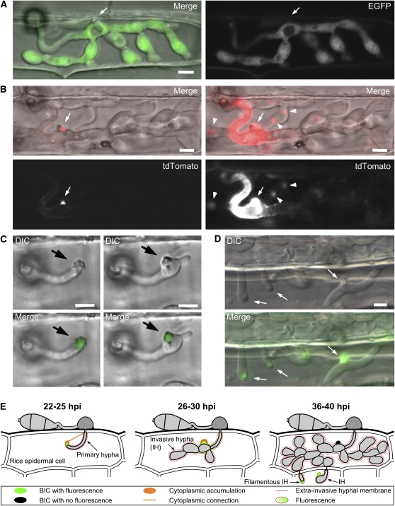 Knowledge remains limited about how fungal pathogens that colonize living plant cells translocate effector proteins inside host cells to regulate cellular processes and neutralize defense responses. To cause the globally important rice blast disease, specialized invasive hyphae (IH) invade successive living rice (Oryza sativa) cells while enclosed in host-derived extrainvasive hyphal membrane. Using live-cell imaging, we identified a highly localized structure, the biotrophic interfacial complex (BIC), which accumulates fluorescently labeled effectors secreted by IH. In each newly entered rice cell, effectors were first secreted into BICs at the tips of the initially filamentous hyphae in the cell. These tip BICs were left behind beside the first-differentiated bulbous IH cells as the fungus continued to colonize the host cell. Fluorescence recovery after photobleaching experiments showed that the effector protein PWL2 (for prevents pathogenicity toward weeping lovegrass [Eragrostis curvula]) continued to accumulate in BICs after IH were growing elsewhere. PWL2 and BAS1 (for biotrophy-associated secreted protein 1), BIC-localized secreted proteins, were translocated into the rice cytoplasm. By contrast, BAS4, which uniformly outlines the IH, was not translocated into the host cytoplasm. Fluorescent PWL2 and BAS1 proteins that reached the rice cytoplasm moved into uninvaded neighbors, presumably preparing host cells before invasion. We report robust assays for elucidating the molecular mechanisms that underpin effector secretion into BICs, translocation to the rice cytoplasm, and cell-to-cell movement in rice.