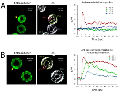 Dysferlin is a Ca(2+)-binding protein found in many different cell types. It is required for membrane wound repair in muscle, but it is not known whether it has the same function in other cells. Here we report the activation of an intercellular signaling pathway in sea urchin embryos by membrane wounding that evokes Ca(2+) spikes in neighboring cells. This pathway was mimicked by ATP application, and inhibited by apyrase, cadmium, and omega-agatoxin-IVA. Microinjection of dysferlin antisense phosphorodiamidate morpholino oligonucleotides blocked this pathway, whereas control morpholinos did not. Co-injection of mRNA encoding human dysferlin with the inhibitory morpholino rescued signaling activity. We conclude that in sea urchin embryos dysferlin mediates Ca(2+)-triggered intercellular signaling in response to membrane wounding.
