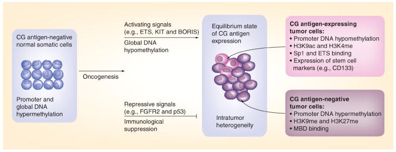 Cancer germline (CG; also known as cancer-testis) antigen genes are normally expressed in germ cells and trophoblast tissues and are aberrantly expressed in a variety of human malignancies. CG antigen genes have high clinical relevance as they encode a class of immunogenic and highly selective tumor antigens. CG antigen-directed immunotherapy is undergoing clinical evaluation for the treatment of a number of solid tumor malignancies and has been demonstrated to be safe, provoke immune responses and be of therapeutic benefit. Achieving an improved understanding of the mechanisms of CG antigen gene regulation will facilitate the continued development of targeted therapeutic approaches against tumors expressing these antigens. Substantial evidence suggests epigenetic mechanisms, particularly DNA methylation, as a primary regulator of CG antigen gene expression in normal and cancer cells as well as in stem cells. The roles of sequence-specific transcription factors and signal transduction pathways in controlling CG antigen gene expression are less clear but are emerging. A combinatorial therapeutic approach involving epigenetic modulatory drugs and CG antigen immunotherapy is suggested based on these data and is being actively pursued. In this article, we review the mechanisms of CG antigen gene regulation and discuss the implications of these mechanisms for the development of cancer immunotherapy approaches targeting CG antigens.