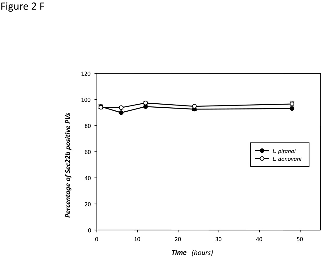 Macrophages that express representative endoplasmic reticulum (ER) molecules tagged with green fluorescence protein were generated to assess the recruitment of ER molecules to Leishmania parasitophorous vacuoles (PVs). More than 90% of PVs harbouring Leishmania pifanoi or Leishmania donovani parasites recruited calnexin, to their PV membrane. An equivalent proportion of PVs also recruited the membrane-associated soluble N-ethylmaleimide-sensitive factor attachment protein receptors (SNAREs), Sec22b. Both ER molecules appeared to be recruited very early in the formation of nascent PVs. Electron microscopy analysis of infected Sec22b/YFP expressing cells confirmed that Sec22b was recruited to Leishmania PVs. In contrast to PVs, it was found that no more than 20% of phagosomes that harboured Zymosan particles recruited calnexin or Sec22b to their limiting phagosomal membrane. The retrograde pathway that ricin employs to access the cell cytosol was exploited to gain further insight into ER-PV interactions. Ricin was delivered to PVs in infected cells incubated with ricin. Incubation of cells with brefeldin A blocked the transfer of ricin to PVs. This implied that molecules that traffic to the ER are transferred to PVs. Moreover the results show that PVs are hybrid compartments that are composed of both host ER and endocytic pathway components.