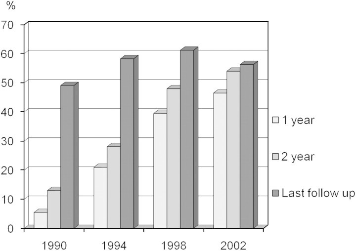 Background. Statin use in renal transplantation has been associated with a lower risk of patient death but not with an improvement of graft functional survival. The aim of this study is to evaluate the effect of statin use in graft survival, death-censored graft survival and patient survival using the data recorded on the Spanish Late Allograft Dysfunction Study Group.Patients and methods. Patients receiving a renal allograft in Spain in 1990, 1994, 1998 and 2002 were considered. Since the mean follow-up in the 2002 cohort was 3 years, statin use was analysed considering its introduction during the first year or during the initial 2 years after transplantation. Univariate and multivariate Cox regression analyses with a propensity score for statin use were employed to analyse graft survival, death-censored graft survival and patient survival.Results. In the 4682 evaluated patients, the early statin use after transplantation significantly increased from 1990 to 2002 (12.7%, 27.9%, 47.7% and 53.0%, P < 0.001). Statin use during the first year was not associated with graft or patient survival. Statin use during the initial 2 years was associated with a lower risk of graft failure (relative risk [RR] = 0.741 and 95% confidence interval [CI] = 0.635-0.866, P < 0.001) and patient death (RR = 0.806 and 95% CI = 0.656-0.989, P = 0.039). Death-censored graft survival was not associated with statin use during the initial 2 years.Conclusion. The early introduction of statin treatment after transplantation is associated with a significant decrease in late graft failure due to a risk reduction in patient death.