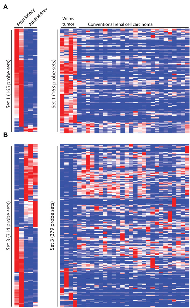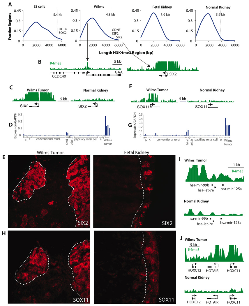 Wilms tumor is the most common pediatric kidney cancer. To identify transcriptional and epigenetic mechanisms that drive this disease, we compared genome-wide chromatin profiles of Wilms tumors, embryonic stem cells (ESCs), and normal kidney. Wilms tumors prominently exhibit large active chromatin domains previously observed in ESCs. In the cancer, these domains frequently correspond to genes that are critical for kidney development and expressed in the renal stem cell compartment. Wilms cells also express "embryonic" chromatin regulators and maintain stem cell-like p16 silencing. Finally, Wilms and ESCs both exhibit "bivalent" chromatin modifications at silent promoters that may be poised for activation. In Wilms tumor, bivalent promoters correlate to genes expressed in specific kidney compartments and point to a kidney-specific differentiation program arrested at an early-progenitor stage. We suggest that Wilms cells share a transcriptional and epigenetic landscape with a normal renal stem cell, which is inherently susceptible to transformation and may represent a cell of origin for this disease.