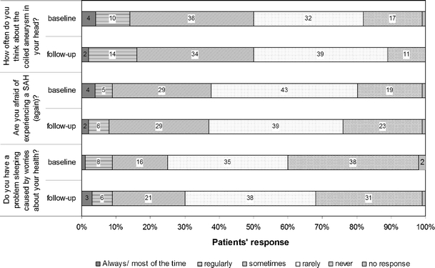 Results: Any problem with anxiety or depression was reported in 56 of 120 patients (47%; 95%CI38↔56%) at baseline and 42 of 100 patients (42%; 95%CI32↔52%) at 3 months, equally for screen-positives and -negatives. Compared to the reference population, participants scored 38% (95%CI9↔67%) and 27% (95%CI4↔50%) more often any problem with anxiety or depression. Three months after screening, 21% (20 of 92) of screen-negatives and 13% (one of eight) of screen-positives reported to be less afraid of subarachnoid hemorrhage (SAH) compared to before screening. One of eight screen-positives reported increased fear of SAH.