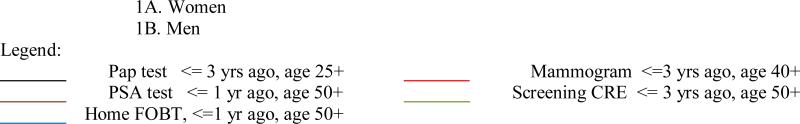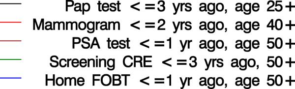 Conclusions: There remain large gaps in use for all screening modalities by education, income, usual source of care, health insurance, and recent physician contact. These specific populations would benefit from interventions to overcome these barriers to screening.