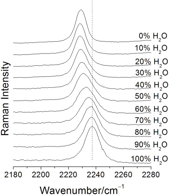 The incorporation of unnatural amino acids into proteins that act as spectroscopic probes can be used to study protein structure and function. One such probe is 4-cyanophenylalanine (PheCN), the nitrile group of which has a stretching mode that occurs in a region of the vibrational spectrum that does not contain any modes from the usual components of proteins and the wavenumber is sensitive to the polarity of its environment. In this work we evaluate the potential of UV resonance Raman spectroscopy for monitoring the sensitivity of the νC≡N band of PheCN incorporated into proteins to the protein environment. Measurement of the Raman excitation profile of PheCN showed that considerable resonance enhancement of the Raman signal was obtained using UV excitation and the best signal-to-noise ratios were obtained with excitation wavelengths of 229 and 244 nm. The detection limit for PheCN in proteins was ~10 μM, approximately a hundred-fold lower than the concentrations used in IR studies, which increases the potential applications of PheCN as a vibrational probe. The wavenumber of the PheCN νC≡N band was strongly dependent on the polarity of its environment, when the solvent was changed from H(2)O to THF it decreased by 8 cm(-1). The presence of liposomes caused a similar though smaller decrease in νC≡N for a peptide, mastoparan X, modified to contain PheCN. The selectivity and sensitivity of resonance Raman spectroscopy of PheCN mean that it can be a useful probe of intra- and intermolecular interactions in proteins and opens the door to its application in the study of protein dynamics using time-resolved resonance Raman spectroscopy.
