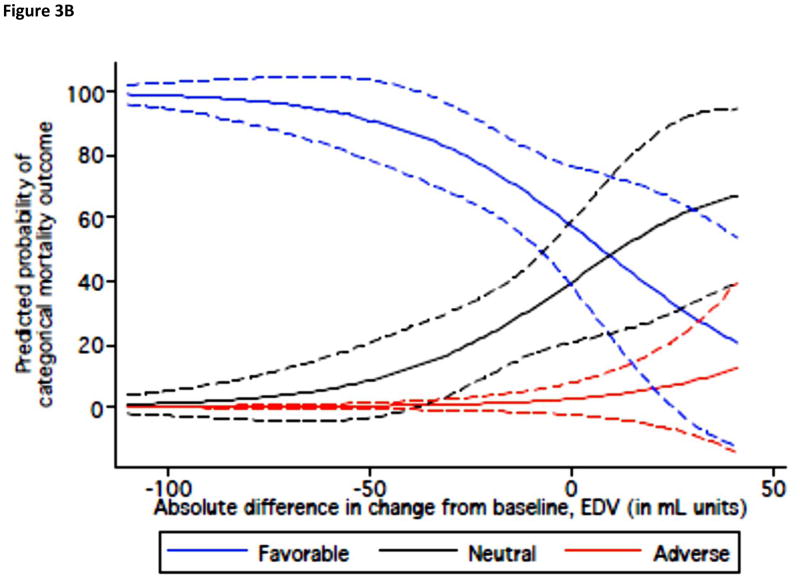 Background: Whether therapy-induced changes in left ventricular ejection fraction (LVEF), end-diastolic volume (EDV), and end-systolic volume (ESV) are predictors of mortality in patients with LVD is not established.