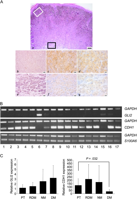 Methods: We used real-time reverse transcription-polymerase chain reaction (RT-PCR) and western blotting to determine GLI2 expression in human melanoma cell lines and subsequently classified them as GLI2high or as GLI2low according to their relative GLI2 mRNA and protein expression levels. GLI2 expression was reduced in a GLI2high cell line with lentiviral expression of short hairpin RNA targeting GLI2. We assessed the role of GLI2 in melanoma cell invasiveness in Matrigel assays. We measured secretion of matrix metalloproteinase (MMP)-2 and MMP-9 by gelatin zymography and expression of E-cadherin by western blotting and RT-PCR. The role of GLI2 in development of bone metastases was determined following intracardiac injection of melanoma cells in immunocompromised mice (n = 5-13). Human melanoma samples (n = 79) at various stages of disease progression were analyzed for GLI2 and E-cadherin expression by immunohistochemistry, in situ hybridization, or RT-PCR. All statistical tests were two-sided.