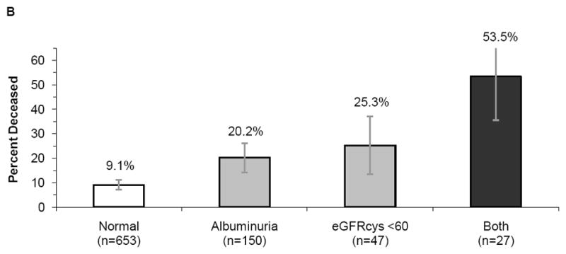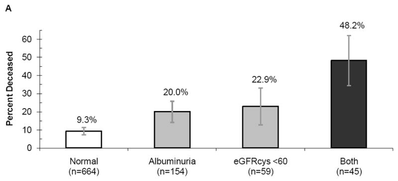 Results: At baseline, decreased kidney function (eGFR(SCysC) <60 mL/min/1.73 m(2)) or albuminuria was present in 28% of participants. After 5 years of follow-up, mortality was 48% in those with both eGFR(SCysC) < 60 mL/min/1.73 m(2) and albuminuria, 23% in those with eGFR(SCysC) < 60 mL/min/1.73 m(2) alone, 20% in those with albuminuria alone, and 9% in those with neither condition. After multivariable adjustment for demographics, cardiovascular risk factors, HIV-related factors, and inflammatory marker levels, eGFR(SCysC) < 60 mL/min/1.73 m(2) and albuminuria were associated with a nearly 2-fold increase in mortality, whereas eGFR(SCr) < 60 mL/min/1.73 m(2) did not appear to have a substantial association with mortality. Together, eGFR(SCysC) <60 mL/min/1.73 m(2) and albuminuria accounted for 17% of the population-level attributable risk of mortality.