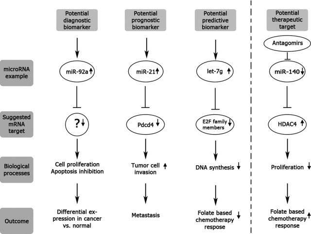 Colorectal cancer is a leading cause of cancer-related morbidity and mortality in the Western world. While improved diagnostic surveillance and treatment strategies involving surgery, chemo-, and radiotherapy have all contributed to earlier detection and improved survival, treatment decisions are still made almost exclusively based on the cancer's clinicopathological stage at diagnosis. Therefore, the search for new biomarkers to facilitate early diagnosis and individualized treatment is particularly warranted. MicroRNAs (miRNAs) are short, noncoding RNAs that regulate gene expression through posttranscriptional interactions with mRNA, thereby potentially leading to a vast range of downstream effects that depend on the target proteins affected. The discovery that miRNAs may act as either oncogenes or tumor suppressors has initiated extensive research in the cancer field, leading to the identification of numerous miRNAs implicated in carcinogenesis and tumor progression. MiRNAs are chemically stable and can thus be detected in a broad range of clinical samples, making these molecules particularly attractive as potential biomarkers in cancer. While the knowledge of miRNA involvement in colorectal cancer biology is less extensive than for other cancer types and several targets with potential biological and clinical relevance have been identified, a significant amount of research is still needed. In this review, we explore the literature regarding the relevance of miRNAs in colorectal cancer, focusing in particular on miRNAs as potential diagnostic, prognostic, and predictive biomarkers.