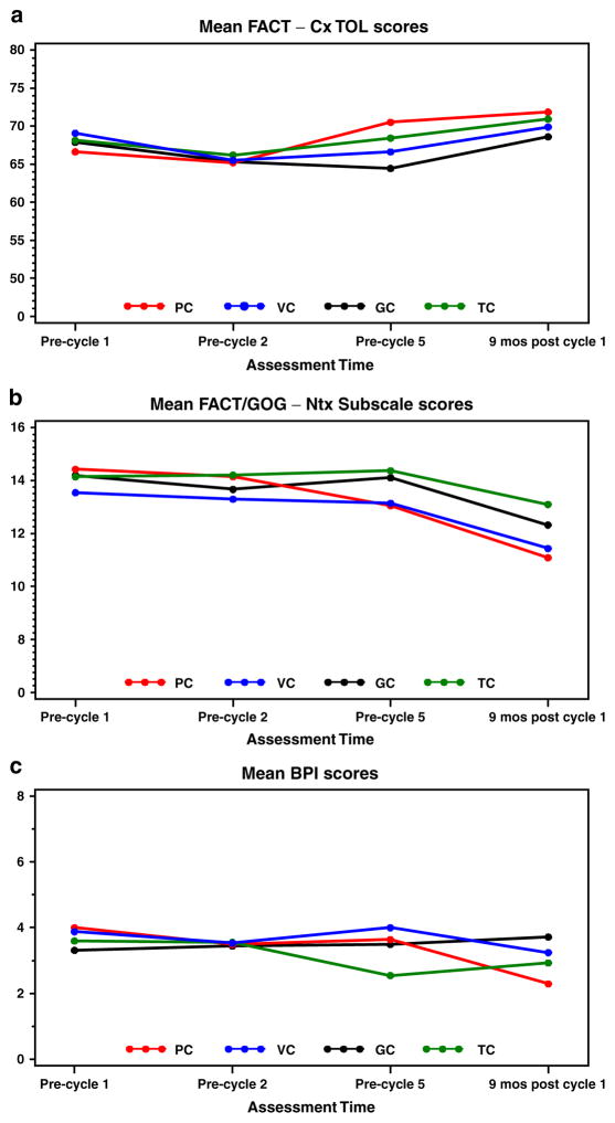 Methods: Patients were randomized to three-week cycles of paclitaxel + cisplatin (PC); vinorelbine + C (VC); gemcitabine + C (GC); or topotecan + C (TC). We report HRQL results from data available on 434 eligible patients enrolled into this 513 patient trial. HRQL was assessed with the Functional Assessment of Cancer Therapy-Cervix (FACT-Cx) the FACT/Gynecologic Oncology Group (FACT/GOG) four-item neurotoxicity scale, and the 0-10 "worst pain" item from the Brief Pain Inventory, at baseline (pre-treatment), prior to beginning cycle 2, prior to beginning cycle 5, and at 9 months after enrollment. As reported by Monk et al. (2009) [13] VC, GC and TC were found not to be superior to PC with regard to progression-free survival or overall survival.