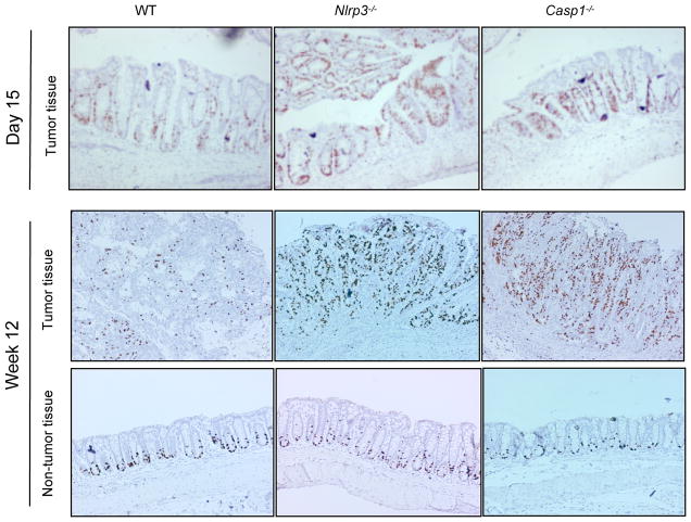 Colorectal cancer is a leading cause of cancer-related deaths worldwide. Chronic inflammation is recognized as a predisposing factor for the development of colon cancer, but the molecular mechanisms linking inflammation and tumorigenesis have remained elusive. Recent studies revealed a crucial role for the NOD-like receptor protein Nlrp3 in regulating inflammation through the assembly of proinflammatory protein complexes termed inflammasomes. However, its role in colorectal tumor formation remains unclear. In this study, we showed that mice deficient for Nlrp3 or the inflammasome effector caspase-1 were highly susceptible to azoxymethane/dextran sodium sulfate-induced inflammation and suffered from dramatically increased tumor burdens in the colon. This was a consequence of markedly reduced IL-18 levels in mice lacking components of the Nlrp3 inflammasome, which led to impaired production and activation of the tumor suppressors IFN-γ and STAT1, respectively. Thus, IL-18 production downstream of the Nlrp3 inflammasome is critically involved in protection against colorectal tumorigenesis.