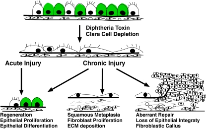 Methods: A transgenic mouse model was generated to conditionally express diphtheria toxin A to ablate Clara cells in the adult lung. Epithelial regeneration and peribronchiolar fibrosis were assessed after acute and chronic Clara cell depletion.