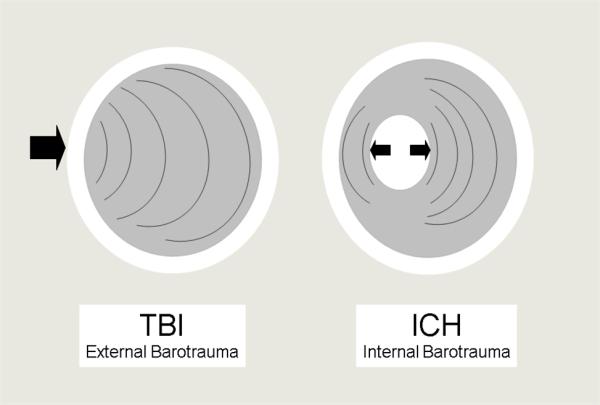 Nontraumatic intracerebral hemorrhage (ICH) remains a devastating condition with 30-day mortality rates of 35% to 52%. Until the pathophysiology of this condition is better understood, it will not be possible to develop effective therapies. Studies of cerebral blood flow and metabolism in patients with acute ICH show similar abnormalities to those that occur in patients with traumatic brain injury, thus raising the question of whether there are common mechanisms of injury shared by the 2 conditions. In both ICH and traumatic brain injury, there is an early reduction in the cerebral metabolic rate of oxygen without ischemia, mitochondrial dysfunction, and transient focal increases in regional glucose metabolism that occur after a few days. ICH and traumatic brain injury share barotrauma from pressure waves that propagate through the intracranial contents as a common mechanism of brain injury. Recent data demonstrating contralateral hemispheric damage in patients with acute ICH provide further support for this theory of common injury mechanisms.
